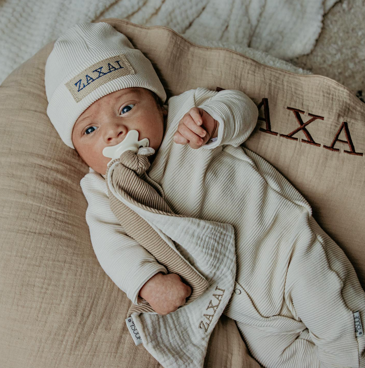 Ecru is een veelzijdige basis die prachtig samengaat met vrijwel alle kleuren. Combineer het met een gepersonaliseerde muts voor een subtiel en persoonlijk accent.