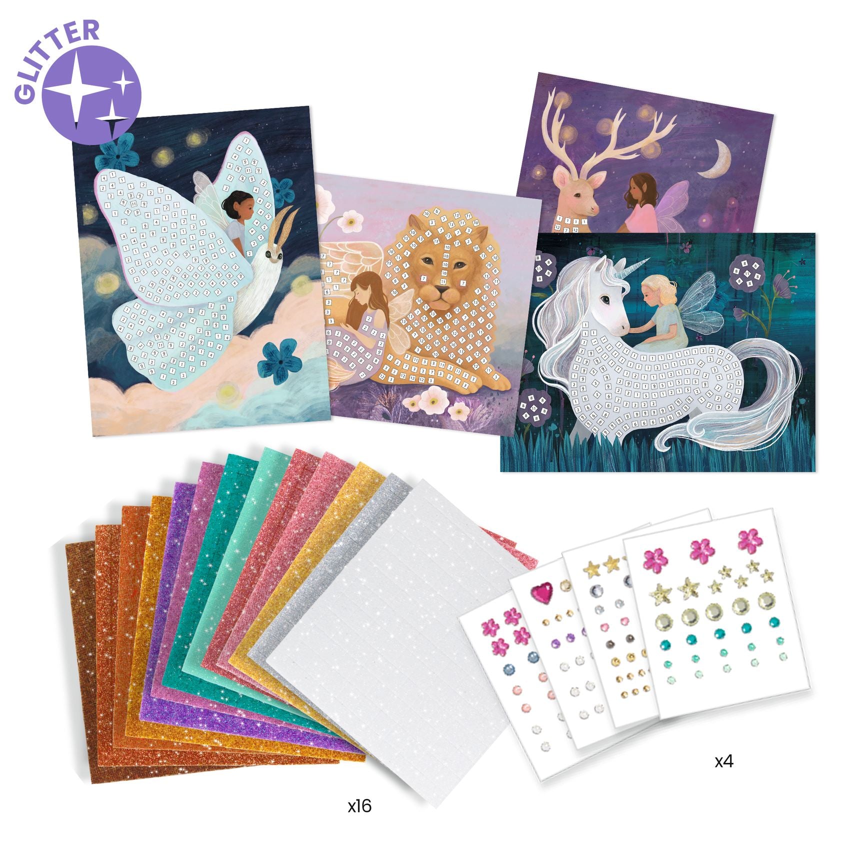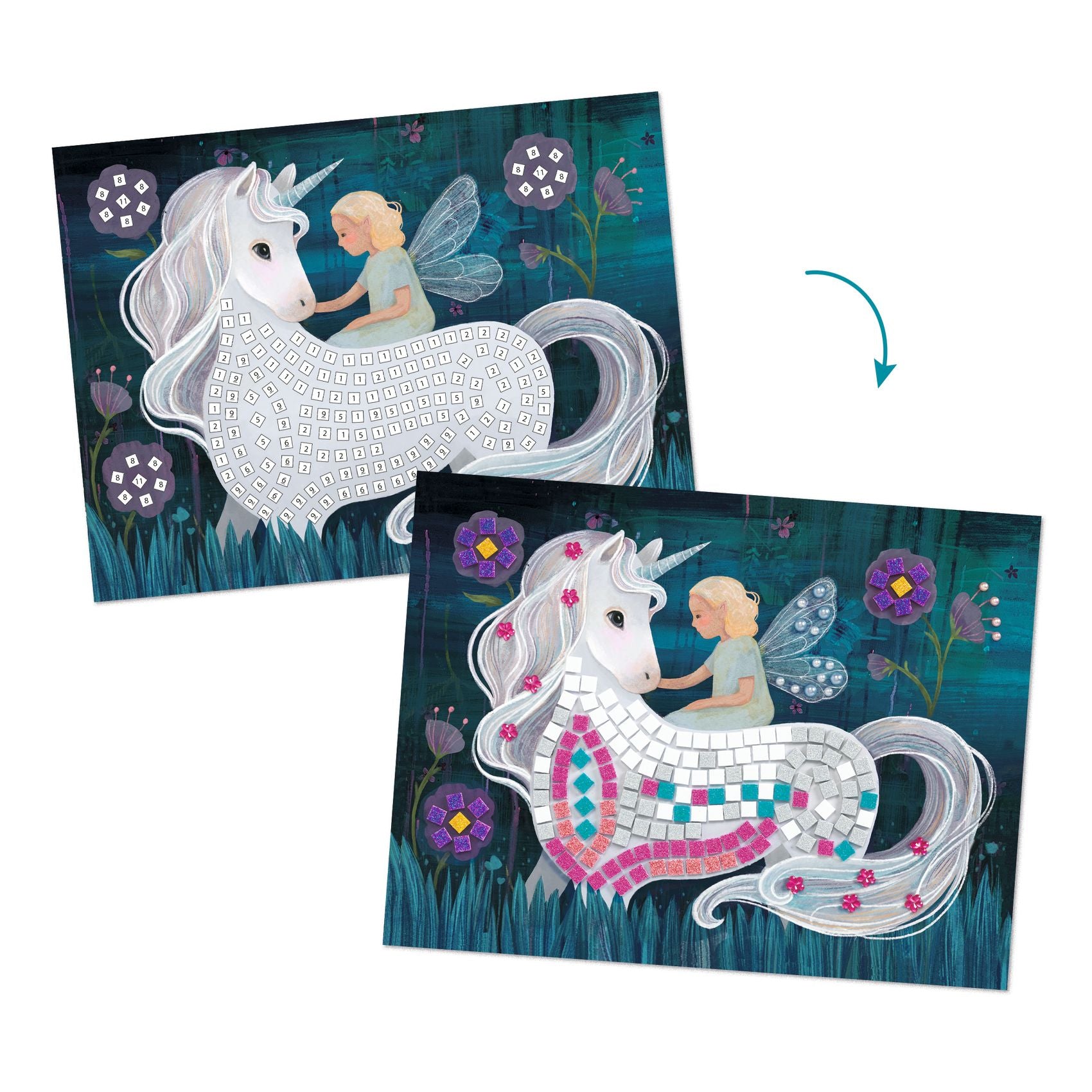 Laat de magie tot leven komen met deze unicorn mozaïekset. Vier fantasierijke illustraties worden versierd met kleine vierkante stickers van metallic foampapier. Door de cijfers op de platen te volgen, plakken kinderen eenvoudig de juiste kleuren op de juiste plek. Zo ontstaan sprankelende afbeeldingen van een magische wereld.